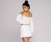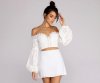 Show off those shoulders with this detailed crop top! This beautifully detailed crop features an off the shoulder?sweetheart style neckline, lined cup area,?balloon sleeves with an elastic stretch wrist,?and a lace up feature in the front. The back contains a zipper closure. This crop is composed of a linen material with eyelet details.