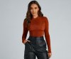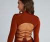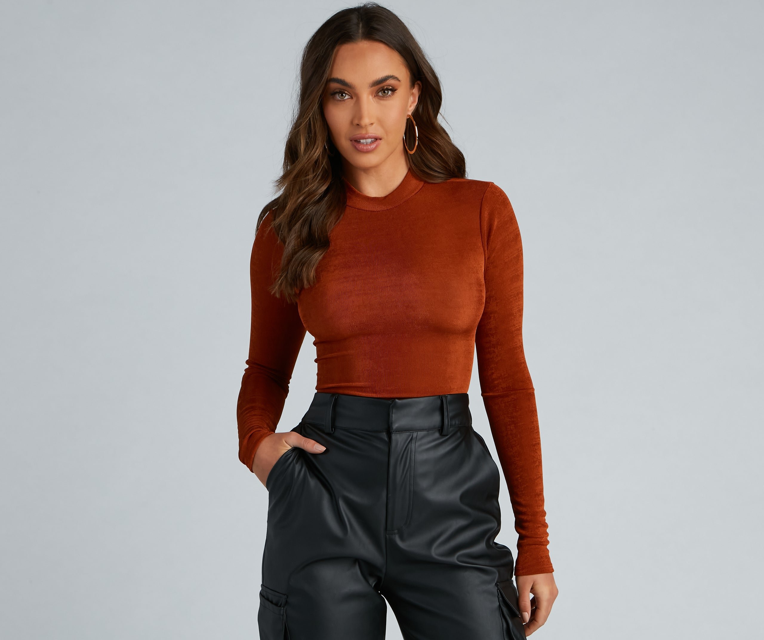 You'll be sure to turn heads in this sultry strappy back bodysuit! It features a trendy mock neckline, long fitted sleeves, an open back with a lace-up design, and a thong bottom with a snap-button closure. Style with a
